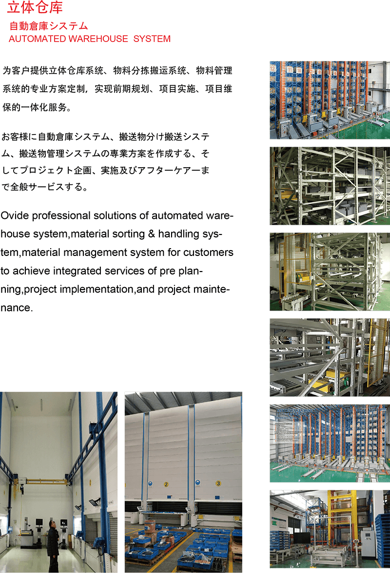 ระบบโลจิสติกส์อัจฉริยะของ บริษัท ช่วยเพิ่มประสิทธิภาพของคลังสินค้าโดยการบูรณาการเทคโนโลยีที่ทันสมัยเช่นหุ่นยนต์เครื่องเรียงลำดับและอุปกรณ์ที่เลือกโดยแสง/ไฟ ระบบเหล่านี้ลดความผิดพลาดของมนุษย์ปรับปรุงการเลือกความแม่นยำและเพิ่มปริมาณงานช่วยให้คลังสินค้าสามารถจัดการคำสั่งซื้อได้มากขึ้นด้วยความเร็วและความแม่นยำมากขึ้น นวัตกรรมเช่น MFC (รถเข็นมัลติฟังก์ชั่น), RBG (ยานพาหนะนำทางหุ่นยนต์) และ FTS (ระบบการขนส่งที่ยืดหยุ่น) มั่นใจได้ว่าแต่ละระบบสามารถปรับขนาดได้ปรับขนาดได้และปรับให้เหมาะสมสำหรับสภาพแวดล้อมที่มีประสิทธิภาพสูง