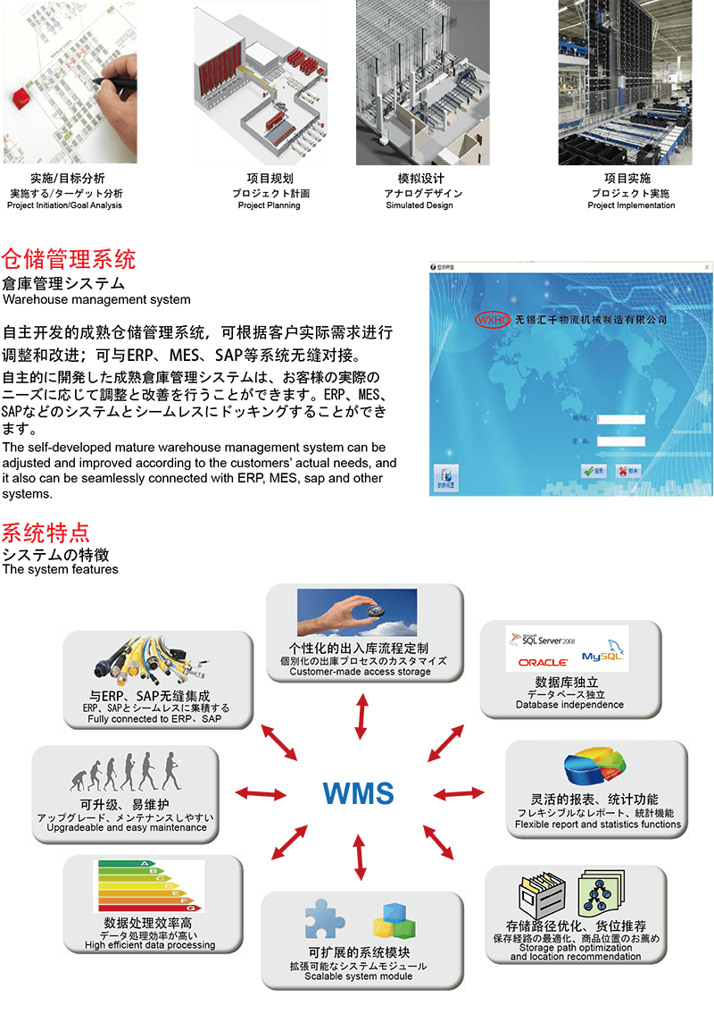 ศูนย์กลางของวิธีการของ Wuxi Huiqian คือระบบการจัดการคลังสินค้าขั้นสูง (WMS) ซึ่งเป็นแพลตฟอร์มที่ยืดหยุ่นซึ่งสามารถปรับแต่งเพื่อตอบสนองความต้องการเฉพาะของลูกค้าแต่ละราย ระบบที่พัฒนาด้วยตนเองนี้รวมเข้ากับ ERP, MES, SAP และเครื่องมือการจัดการธุรกิจอื่น ๆ อย่างราบรื่นช่วยให้สามารถติดตามแบบเรียลไทม์การควบคุมสินค้าคงคลังและการมองเห็นข้อมูลที่เพิ่มขึ้น ด้วยการนำเสนอคุณสมบัติแบบแยกส่วนเช่นการจัดการการจัดเก็บข้อมูลในและออกการบำรุงรักษาระบบและความสามารถในการสืบค้นข้อมูล WMS รองรับธุรกิจในการจัดการทุกอย่างตั้งแต่ฟังก์ชั่นคลังสินค้าพื้นฐานไปจนถึงงานด้านโลจิสติกที่ซับซ้อนมากขึ้น