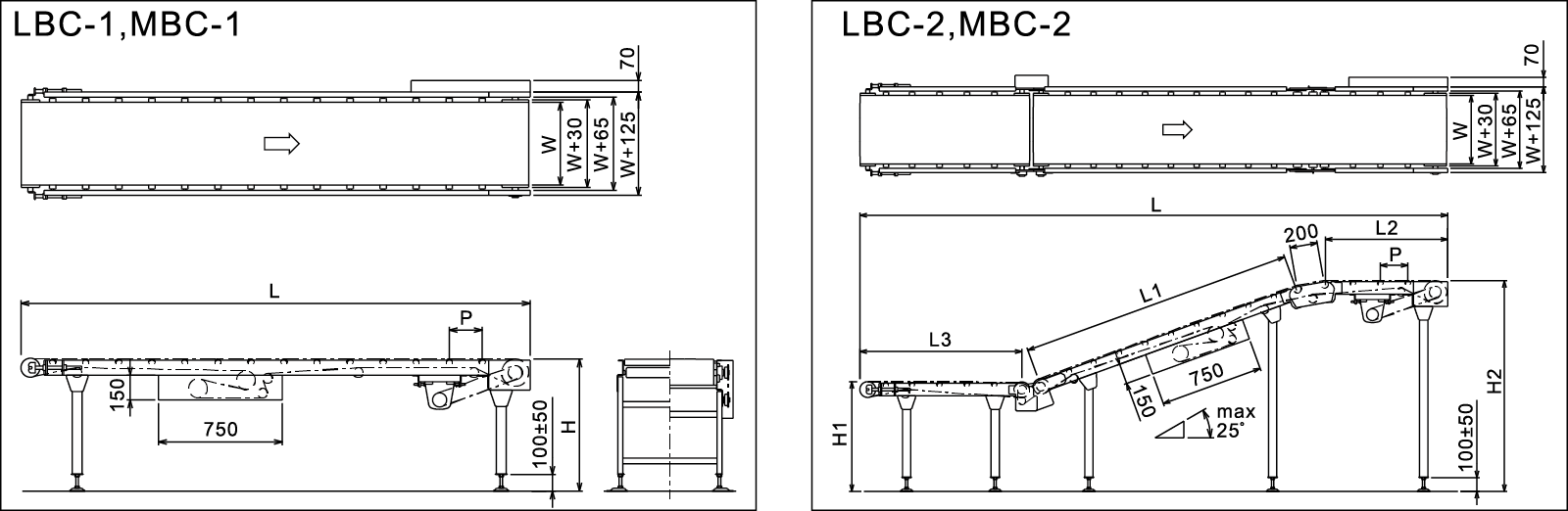| ความกว้างของสายพานลำเลียง | W (มม.) | BW 125 | BW 125 | BW 125 | BW 125 |