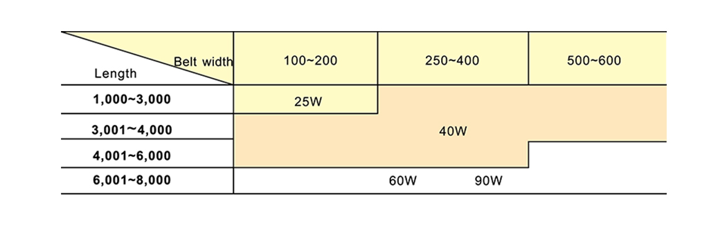 | ความยาวสายพาน | 500 | 1000 | 1500 | 2000 | 2500 | 3000 | 3500 | 4000 | 5000 | 6000 | 7000 | 8000 | ||||||