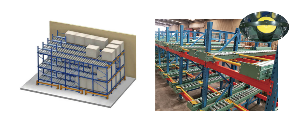 ชั้นวางประเภทแรงโน้มถ่วงและชั้นวางลูกกลิ้งเลื่อนตัวเองมีโครงสร้างคล้ายกับชั้นวางของลำแสง แต่แทร็กลูกกลิ้งที่ไม่ขับเคลื่อนจะถูกติดตั้งบนคานของชั้นวางและมุมเอียงของแทร็คลูกกลิ้งโดยทั่วไป 2-5 ° ชั้นวางแรงโน้มถ่วงใช้มุมเอียงนี้และน้ำหนักของสินค้าเองเพื่อเลื่อนจากสูงไปต่ำโดยอัตโนมัติ ชั้นวางแรงโน้มถ่วงเหมาะสำหรับการไหลออกและการไหลสูง คุณสมบัติหลักของพวกเขาคือการใช้พื้นที่สูงและชั้นวางไม่ต้องการพลังงานภายนอก พวกเขาเหมาะอย่างยิ่งสำหรับการจัดการคลังสินค้าขนาดใหญ่เช่นศูนย์กลางการจัดจำหน่ายเย็นและโลจิสติกส์และสามารถดำเนินการได้โดยรถยกที่สมดุลทั่วไป